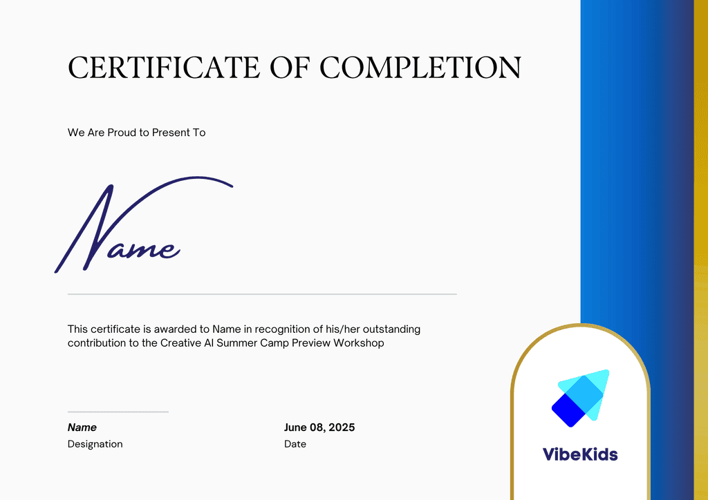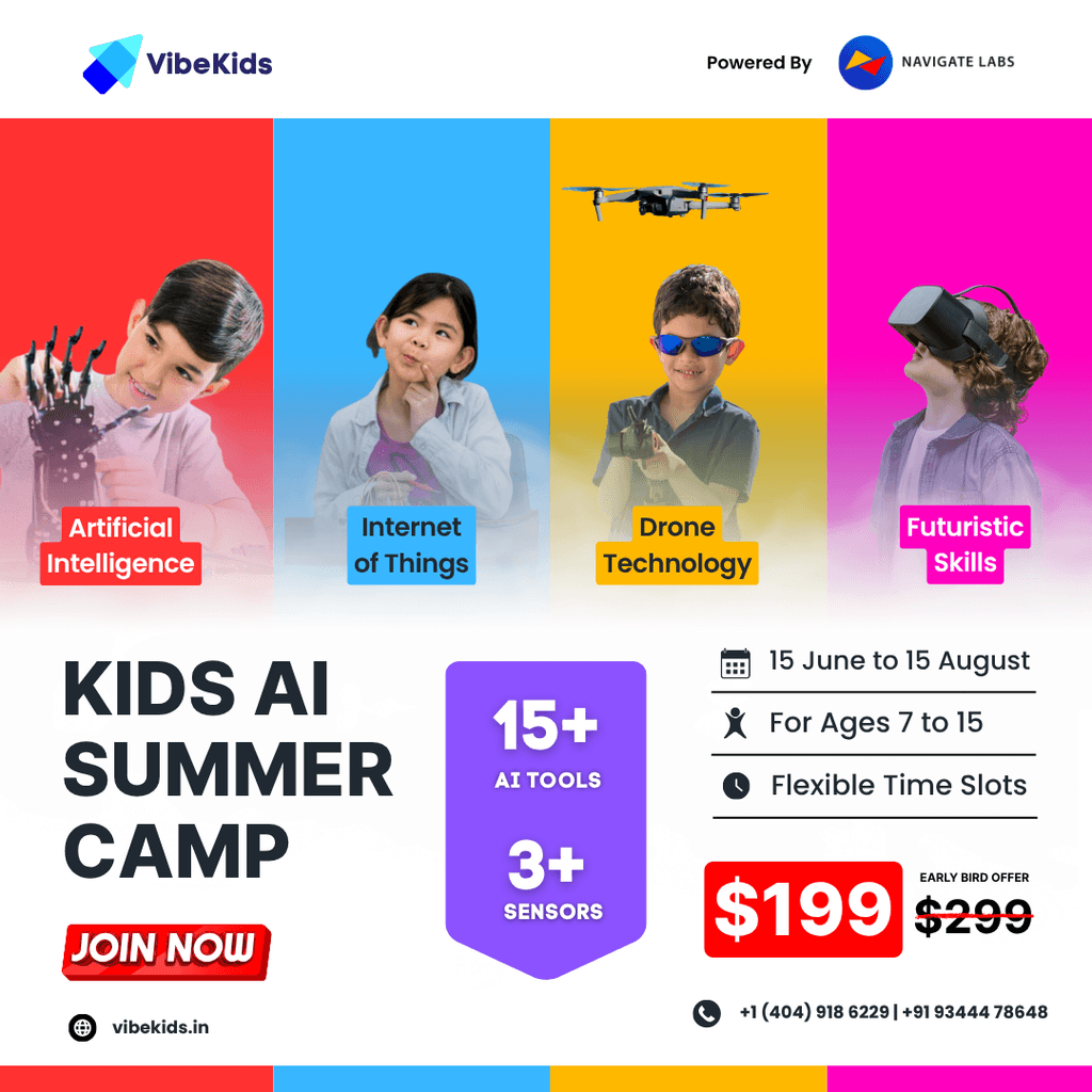 AI Vibe Kids Summer Camp 2025 is a hands-on, online learning program designed to introduce children aged 7 to 15 to the exciting world of Artificial Intelligence, Coding, and Robotics.